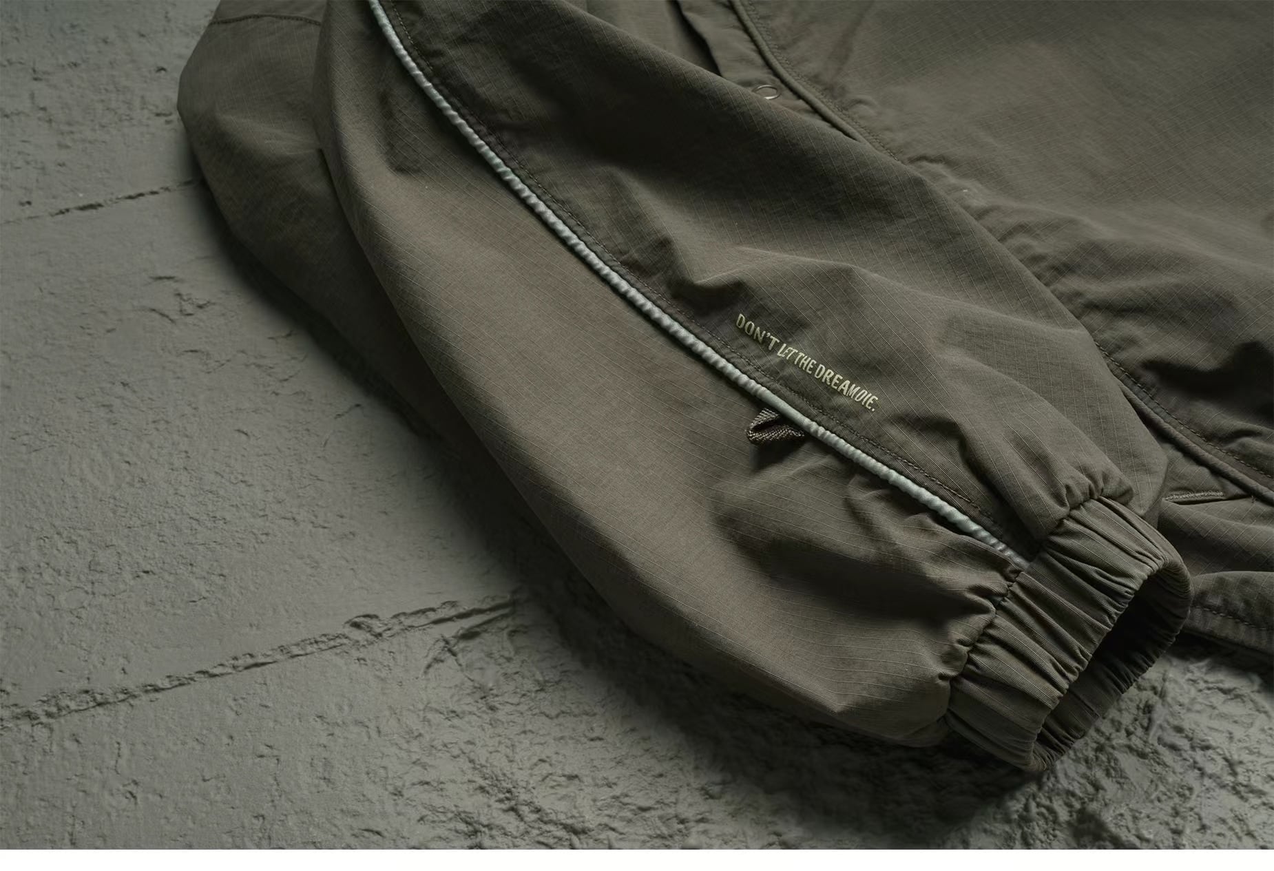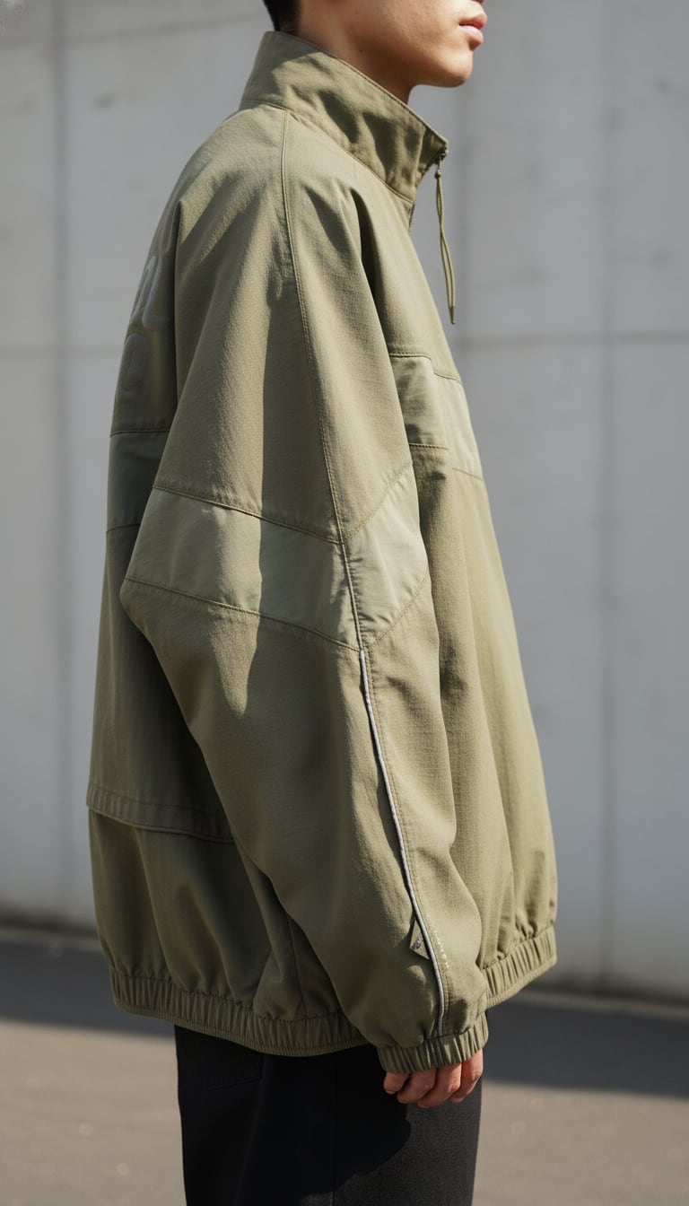 ブランド特注のナイロンリップストップ生地を採用し、自然なシワ感と経年変化による色褪せ特性が、ジャケットのレトロな要素と見事に調和しています。