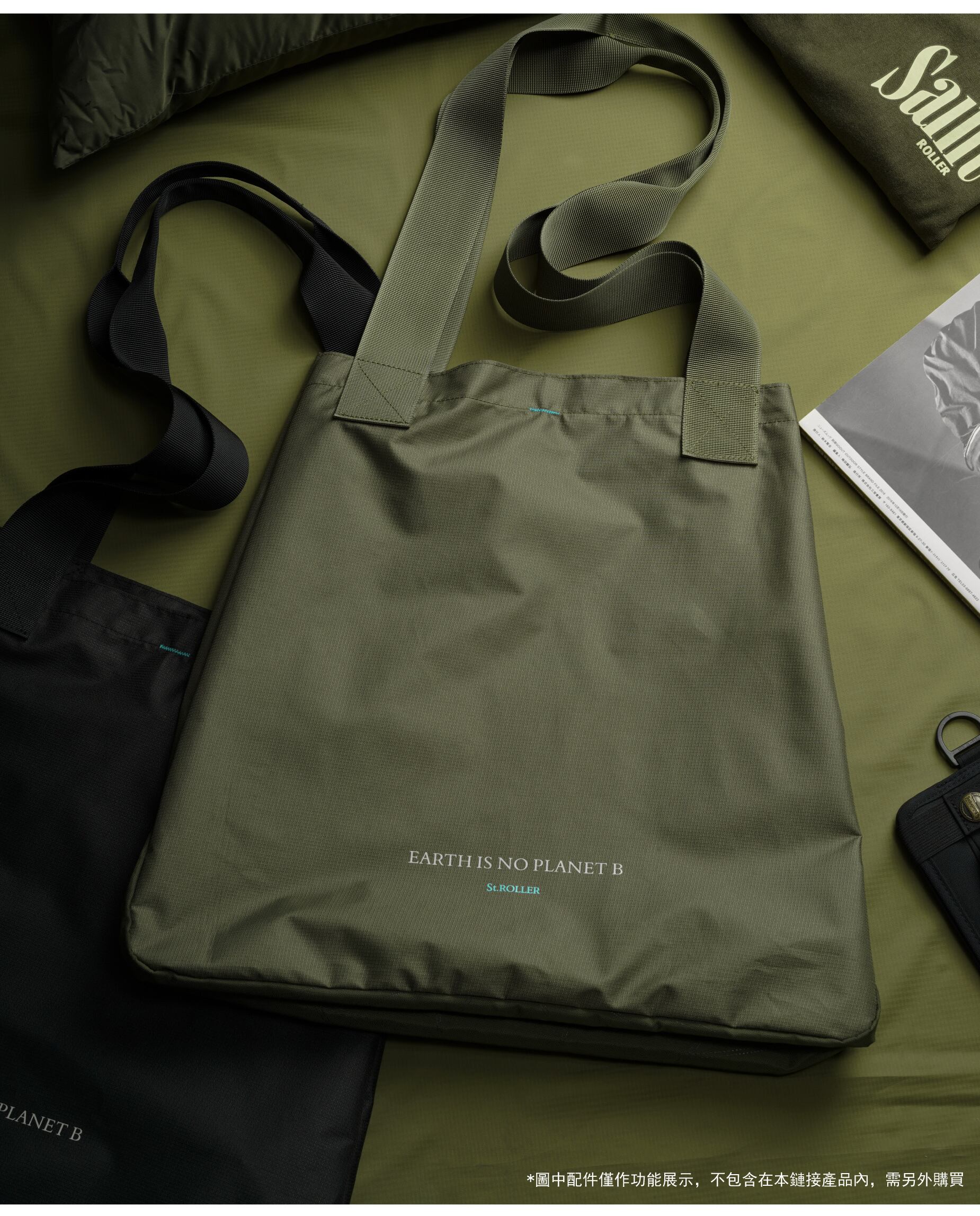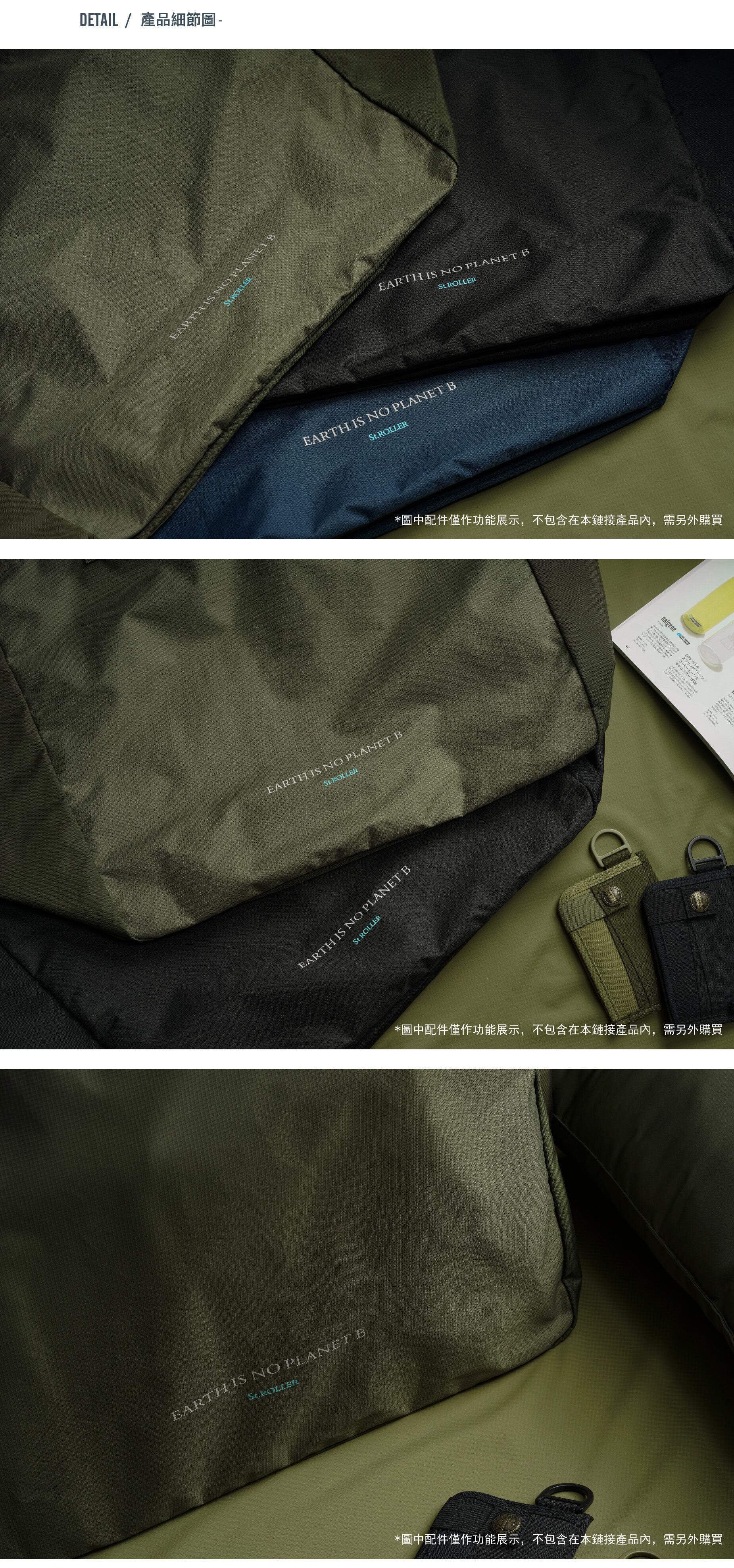 素材には、2種類の再生生地を組み合わせています。両サイドには高密度リサイクルナイロンのオックスフォード織り、中央部分にはリサイクルポリエステルのチェック生地を使用。近似色ながら異なる質感の組み合わせにより、ディテール豊かな表情を実現しました。バッグ正面には環境テーマ「EARTH IS NO PLANET B」のプリント、底面には大きく「100% RECYCLED FABRIC STANDARD」をプリント。トーン・オン・トーンのシルクプリントを採用することで、素材の色調と調和しつつ、日常使いのコーディネートにも違和感なく馴染みます。