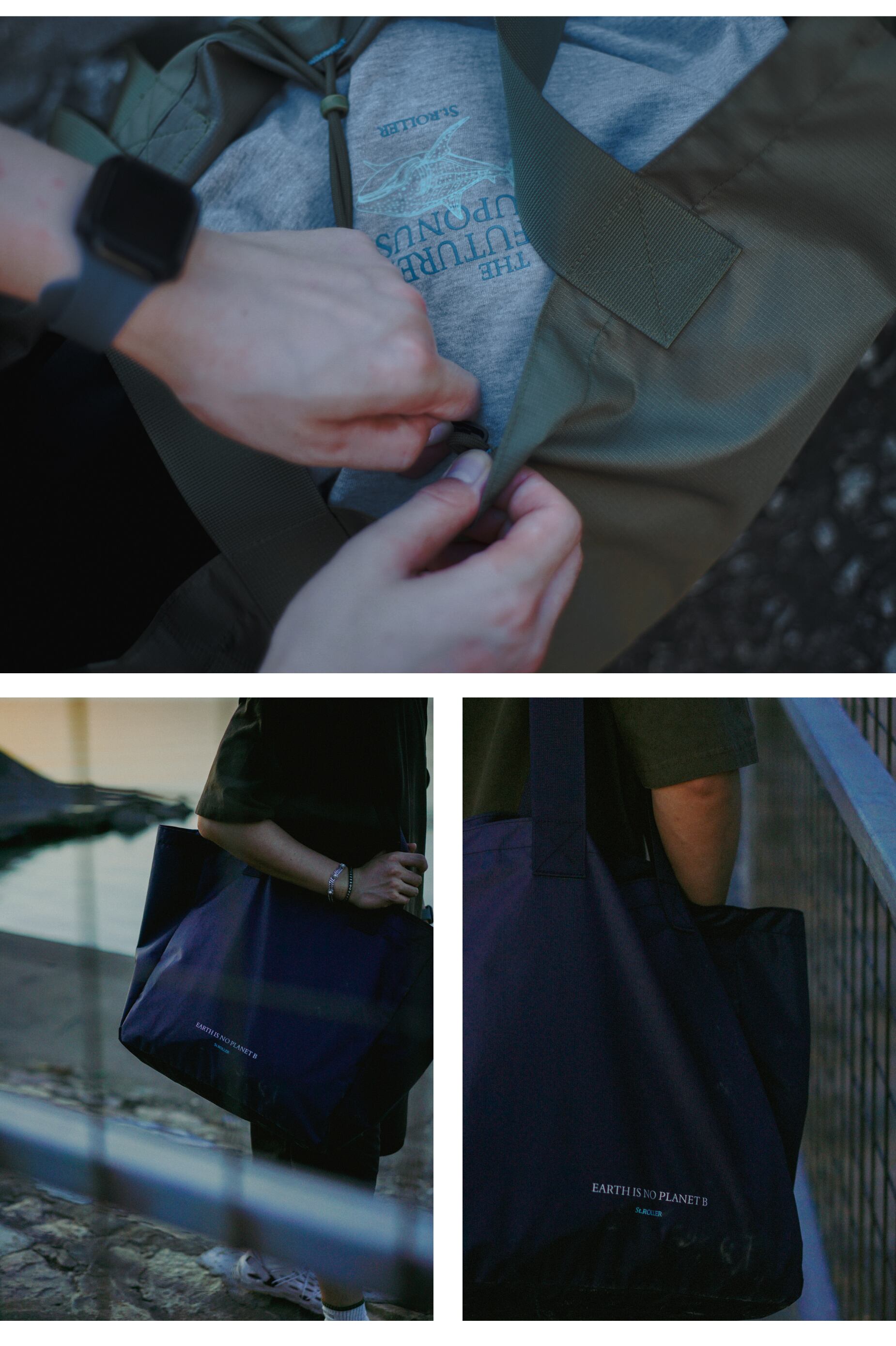 本製品は「NO PLANET B」エコシリーズの第3弾として登場。文字とグラフィックによる視覚的インパクトに加え、実際のプロダクトを通してテーマを直接的に表現しました。容量は60Lの超大容量で、日常の通勤や外出に必要な荷物を十分に収納可能。開口部にはサイズ調整ができるドローコードを備え、荷物の落下防止やバッグ自体をコンパクトに収納する機能を兼ね備えています。さらに開口部両側には日本製Kajitechボタンを採用し、両端を留めることでトートバッグをショルダーバッグへと変形させ、人混みの中でもスムーズに持ち運ぶことができます。