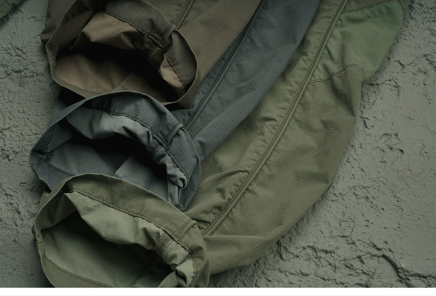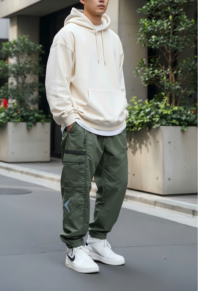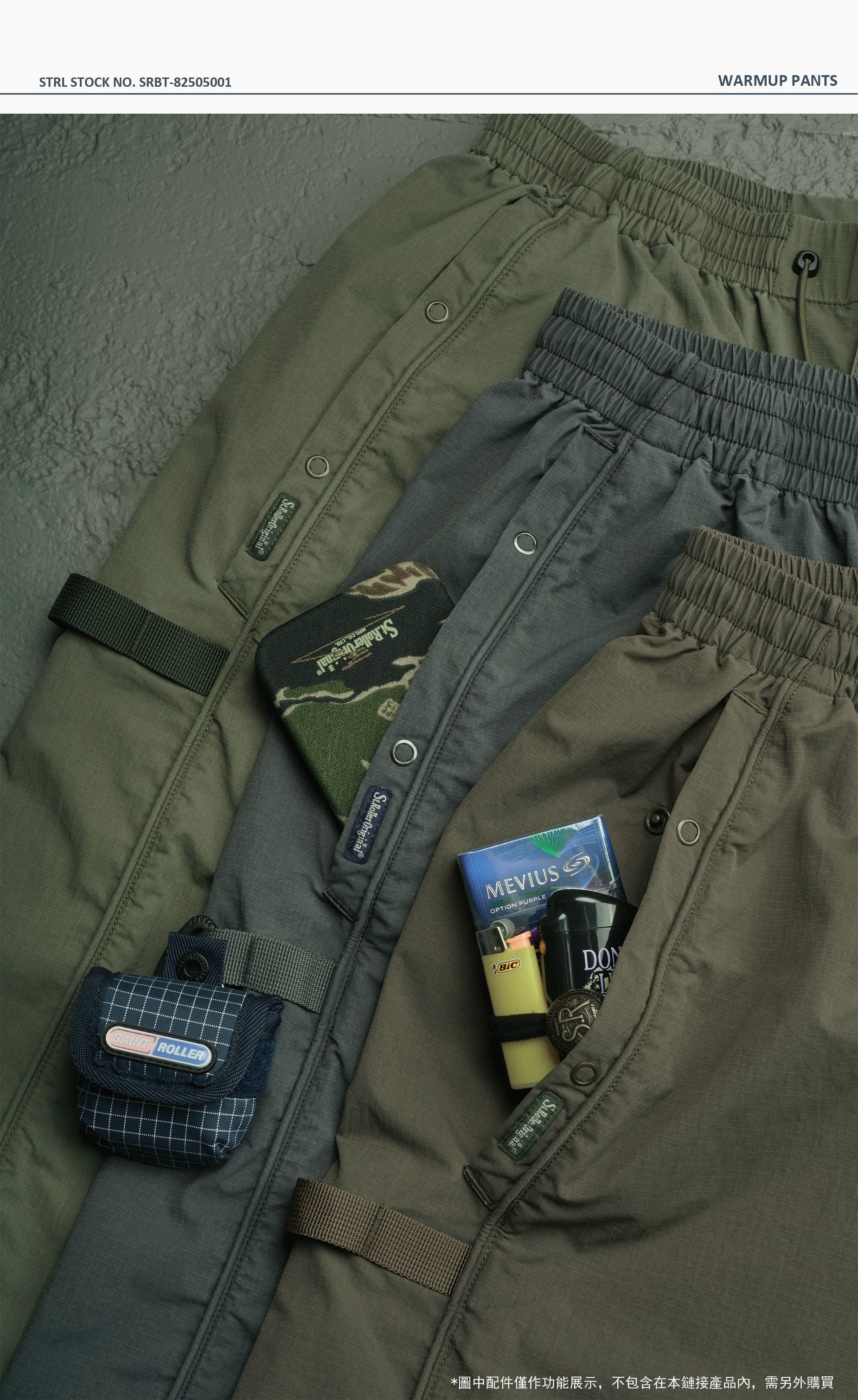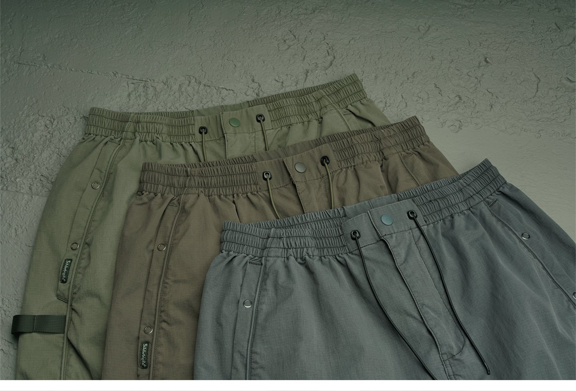 ブランド特注のナイロンリップストップ生地を使用し、独特のシワ感と経年変化による色褪せがパンツのレトロな要素と絶妙にマッチ。両サイドポケットにはYKK製五爪ボタンを採用し、日常の通勤やスポーツ時の収納性と安全性を確保しています。