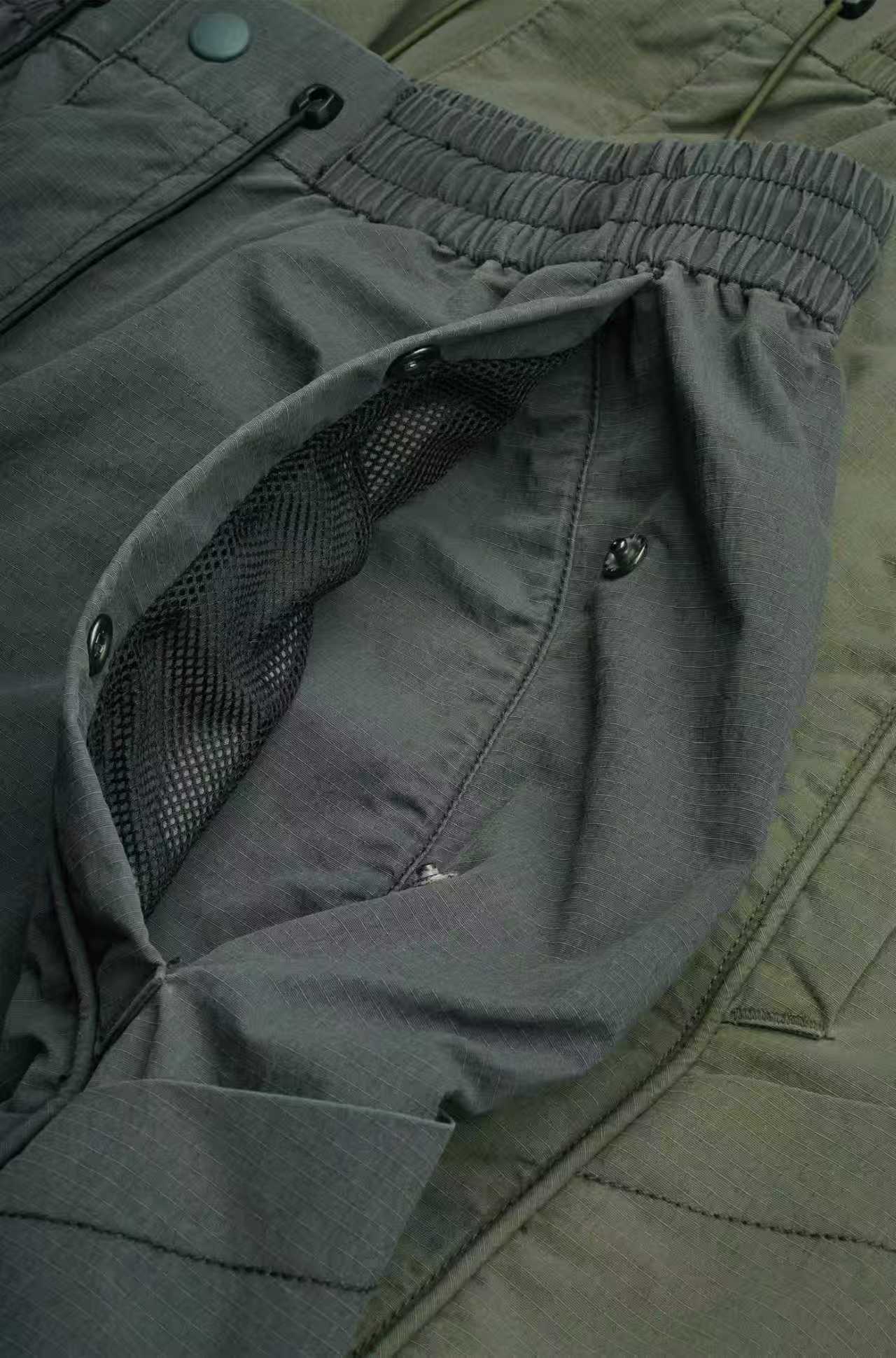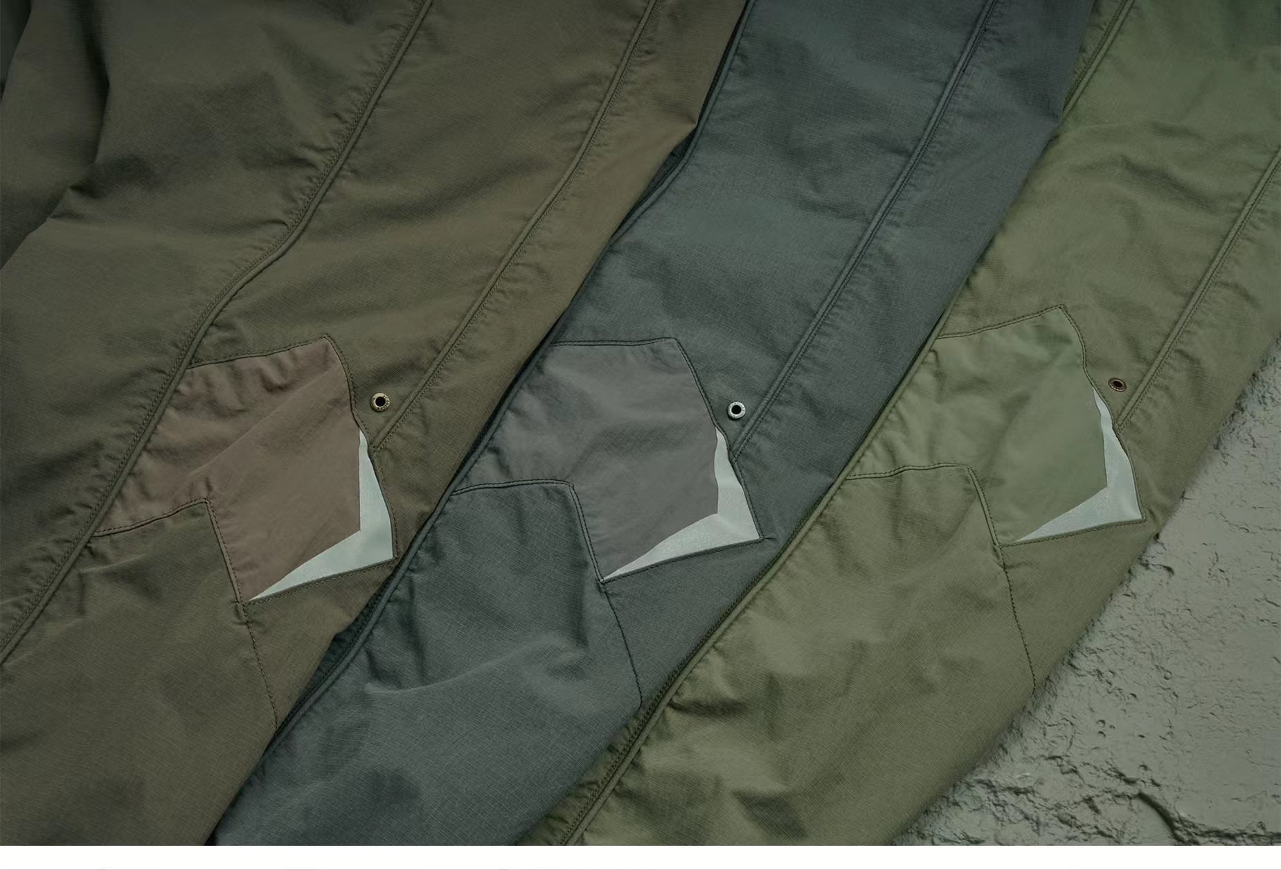 ブランド特注のナイロンリップストップ生地を使用し、独特のシワ感と経年変化による色褪せがパンツのレトロな要素と絶妙にマッチ。両サイドポケットにはYKK製五爪ボタンを採用し、日常の通勤やスポーツ時の収納性と安全性を確保しています。