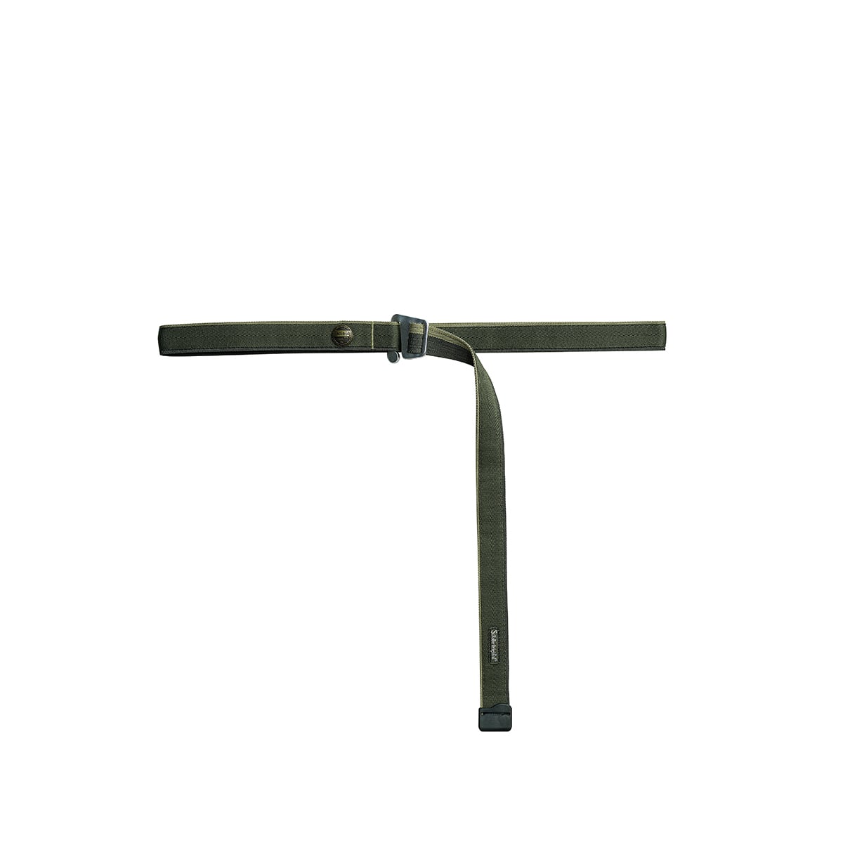 付属金具には、UTX Duraflex社製のクイックリリースアルミニウムバックルを採用。軽量性・堅牢性・着脱の容易さを兼ね備えています。ベルトエンドには同じくUTX Duraflex社製のソフトPVC製シーム可能テープエンドを使用。細部として、バックルを固定するループ部分には、テープカラーに合わせた高密度バータック補強を施し、バックル付近にはブランドのシールド型ロゴをあしらった合金ボタンを配置。これにより、ブランドのパンツ製品と組み合わせることで、ベルトをしっかりと固定可能です。また、ベルトエンド近くにはブランドの織ネームを配し、垂れ下がるテール部分にアクセントを加えています。